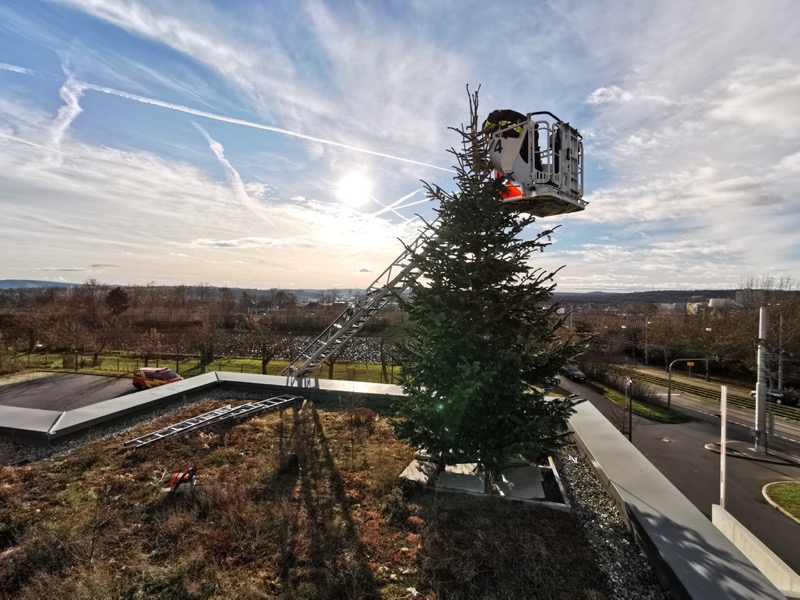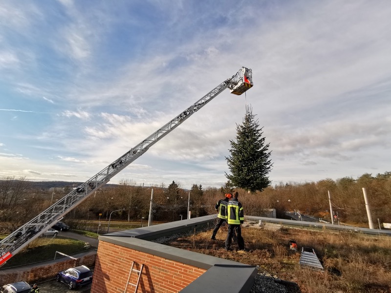 Hier gilt ein ganz herzlicher Dank an die beiden Kollegen der Berufsfeuerwehrwache 4 aus Feuerbach, ohne deren Hilfe es unmöglich gewesen wäre, den Baum allein mit Muskelkraft auf das Dach zu ziehen und aufzurichten.
