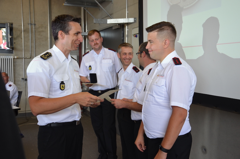 Nach dem Bericht der Branddirektion folgte ein weiterer erfreulicher Tagesordnungspunkt. Aufgrund der besuchten Lehrgänge bzw. erfolgter Dienstzeit konnten folgende Mitglieder befördert werden: Andrej Panarin zum Feuerwehrmann; Benedikt Zahner zum Oberfeuerwehrmann; Florian Stortz zum Hauptfeuerwehrmann.