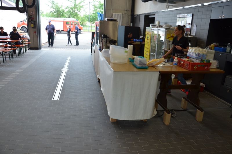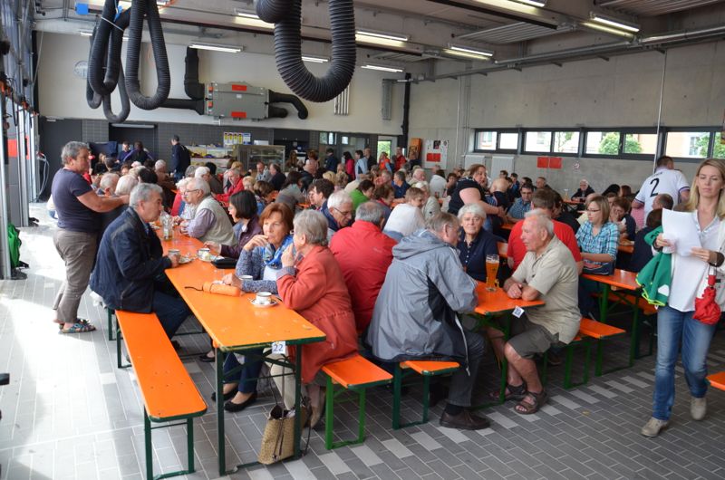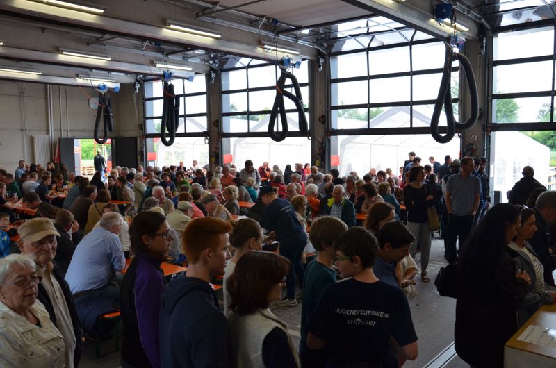 Parallel zu den Führungen konnten sich die Besucher an der reichlich bestückten Kaffee - und Kuchentheke oder am Grillzelt der Feuerwehr Stammheim stärken. Hier gab es wie jedes Jahr wieder Würste aller Art, Steaks, Maultaschen, Pommes oder Wilde Kartoffeln. Dank des neuen, großen Gebäudes konnte für alle Gäste trockene Sitzplätze zur Verfügung gestellt werden, da in der großen Fahrzeughalle und in den drei Zelten jede Menge an überdachten Sitzplätzen zur Verfügung standen.