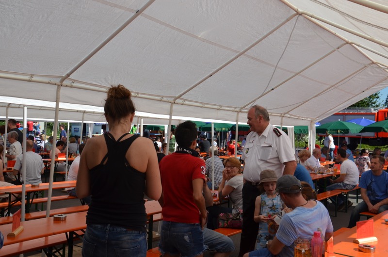 Schon beim Aufbau am Samstagvormittag zeigte sich das Wetter von seiner sonnigen Seite und das ein oder andere T-Shirt der Stammheimer Feuerwehrfrauen und Feuerwehrmänner war noch vor Festbeginn durchgeschwitzt. Als die letzten Aufbauarbeiten fast abgeschlossen waren, mussten die Stammheimer Feuerwehrfrauen und -männer zu einem Feueralarm nach Zuffenhausen ausrücken. Noch während einige der Stammheimer Feuerwehrkräfte an der Einsatzstelle in Zuffenhausen gebunden waen, kamen die ersten Besucher um sich die besten Plätze im Schattten zu sichern. Kaum waren die Einsatzkräfte aus Zuffenhausen zurück, wurden sie abermals alarmiert. Diesmal hatte ein Heimrauchmelder in Stammheim Feueralarm ausgelöst.