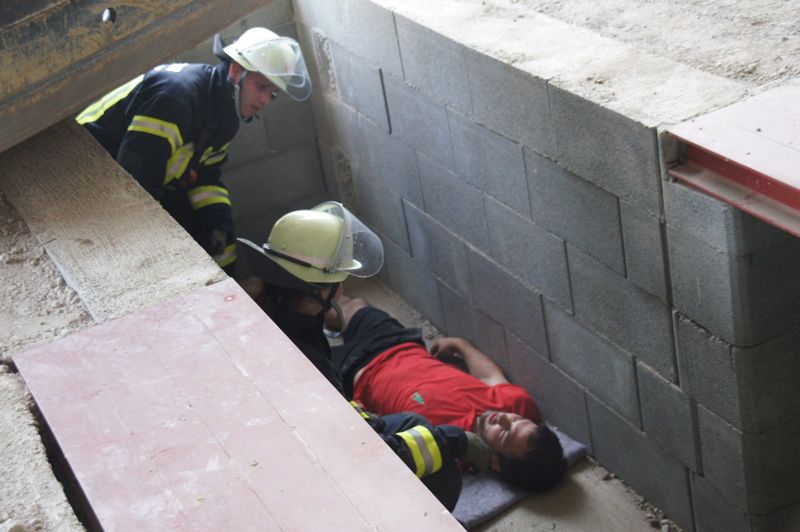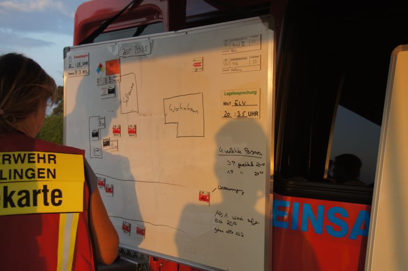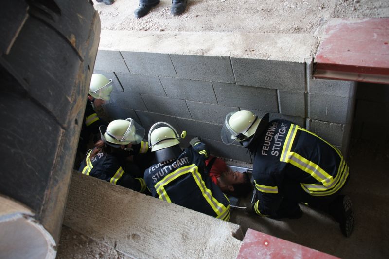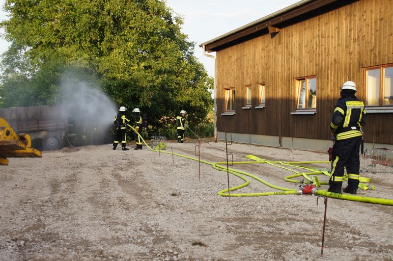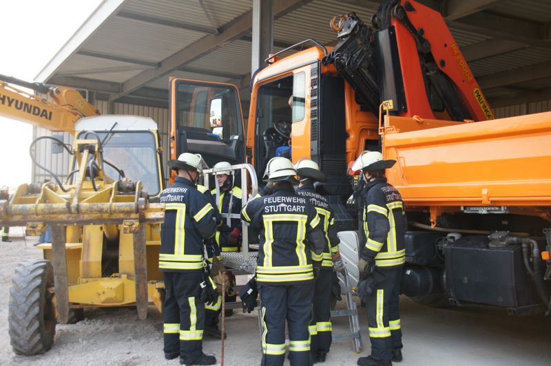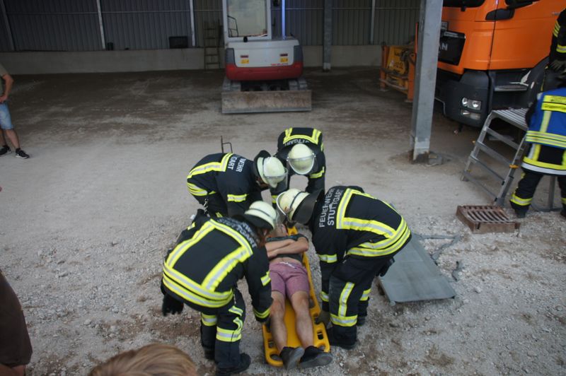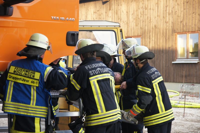 Um kurz nach 19:45 Uhr wurden die beiden Feuerwehren vom Übungsleiter Rolf Baumeister über Handy alarmiert. Auf der Baustelle des Hofes kam es zu einem Betriebsunfall, bei dem ein Bagger und zwei Radlader beteiligt waren. Infolge dessen lag eine schwerverletzte Person in einer Grube, zwei verletze Personen waren in einem LKW eingeschlossen und der Fahrer des Baggers war ebenfalls verletzt. Zusätzlich kam es im hinteren Teil des Hofes zu einem Brand. Die Anfahrt der Einsatzkräfte wurde durch zahlreiche Hindernisse erschwert. Der Einsatzleitwagen der Feuerwehr Möglingen musste von Möglinger Seite zuerst eine Baustellenabschrankung entfernen, um an die Einsatzstelle zu gelangen. Von Stammheimer Seite aus wurde die Zufahrt durch einen LKW blockiert, dessen Fahrer aufgrund eines Schocks sein Fahrzeug quer zur Straße parkte. Der LKW wurde als erstes vom Angriffstrupp des LF 16 aus Stammheim zur Seite gefahren. Somit war eine Zufahrt zur Einsatzstelle möglich. Zwei weitere Trupps des Stammheimer LF 16 führten eine Erstversorgung von einer verletzten Person durch. Am ELW der Feuerwehr Möglingen wurde die Einsatzleitung eingerichtet und zwei Lageabschnitte gebildet. Der erste Abschnitt sorgte für die Wasserversorgung und Brandbekämpfung. Der zweite Abschnitt führte die Menschenrettung durch. Die Wasserversorgung erfolgte über das LF 16 der FF Stammheim von einem etwas weiter entfernt gelegenen Hydranten. Dieser war zuerst durch eine Rüttelplatte blockiert, die entfernt werden musste. Die Brandbekämpfung wurde durch das HLF-2 der Feuerwehr Möglingen durchgeführt. Die Menschenrettung der verletzten Arbeiter erfolgte in Zusammenarbeit der Kräfte des HLF-1 der Feuerwehr Möglingen zusammen mit dem LF 8/6 der Feuerwehr Stammheim. Hierbei wurde die Person in der Grube mit einer Schaufeltrage patientenschonend gerettet. Um die beiden Personen aus dem LKW zu retten, musste zuerst eine Rettungsplattform aufgebaut werden. Dann wurden die Personen mit dem Spineboard gerettet. Nach etwas mehr als einer Stunde war das Übungsszenario erfolgreich abgearbeitet und die beiden Feuerwehren trafen sich noch im Feuerwehrhaus Stammheim zum gemeinsamen Abendessen.