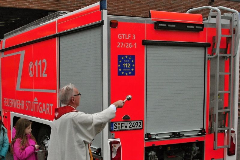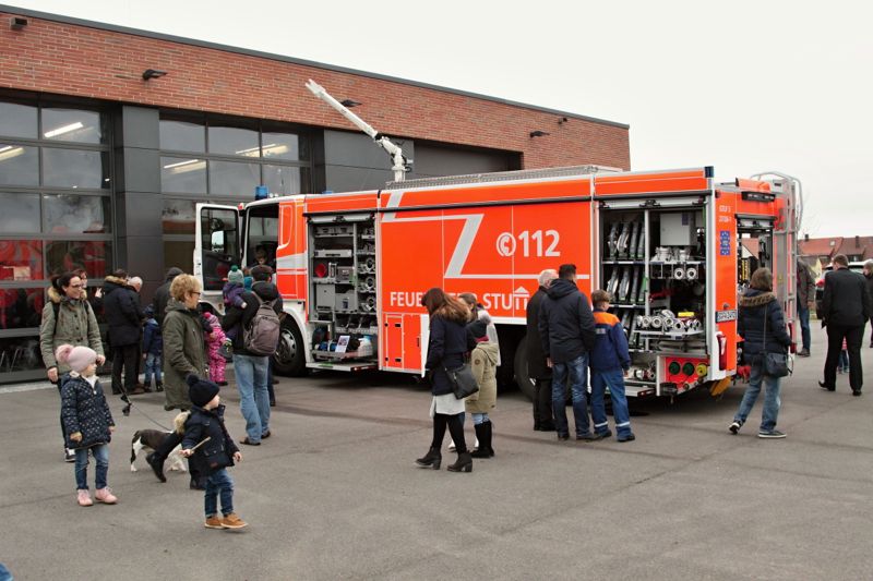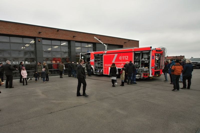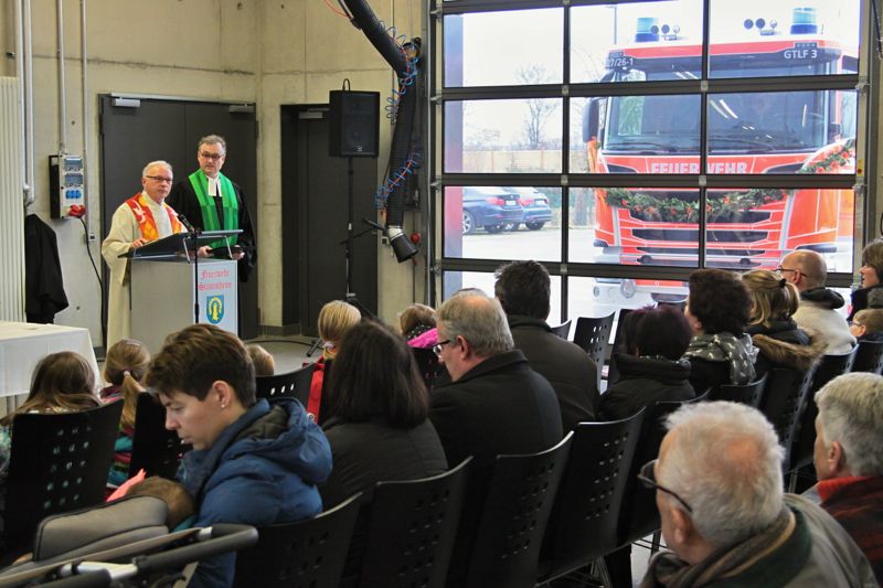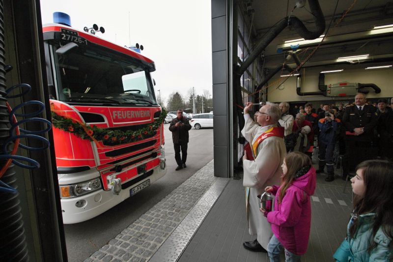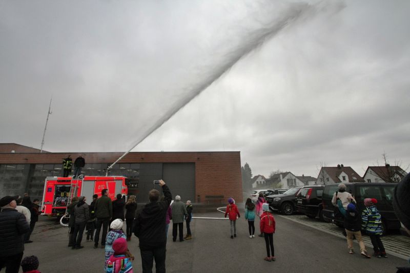 In der nahezu vollbesetzten Fahrzeughalle konnte Kommandant Christian Frey neben Mitgliedern der Aktiven Abteilung, der Jugendfeuerwehr und der Altersabteilung, zahlreiche Gäste der Gemeinde, den Posaunenchor und natürlich den evangelischen Pfarrer Thomas Mann und den katholischen Pfarrer Manfred Griesbeck begrüßen. Nach einer Ansprache von Pfarrer Griesbeck wurde das Fahrzeug von ihm mit Weihwasser geweiht. Im Anschluss an den Gottesdienst konnten alle das Fahrzeug besichtigen. Für die zahlreich anwesenden Kinder war es ein Highlight, einmal auf dem Fahrersitz Platz zu nehmen. Die Gäste konnten sich außerdem von der Leistungsfähigkeit der Fahrzeugpumpe und des Dachmonitors persönlich überzeugen, indem diese im praktischen Einsatz vorgeführt wurden. Parallel konnten sich alle in der Fahrzeughalle mit Hefezopf, Kaffee, Glühwein und Kinderpunsch stärken.