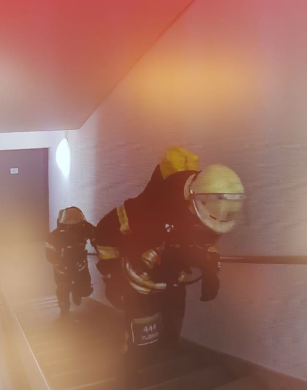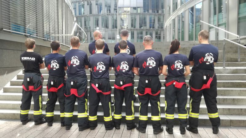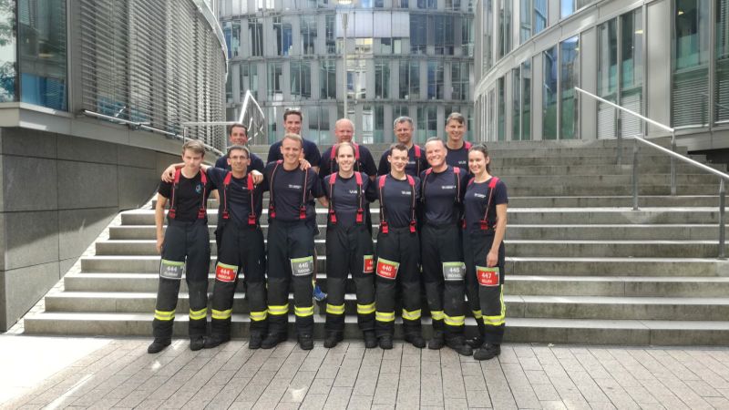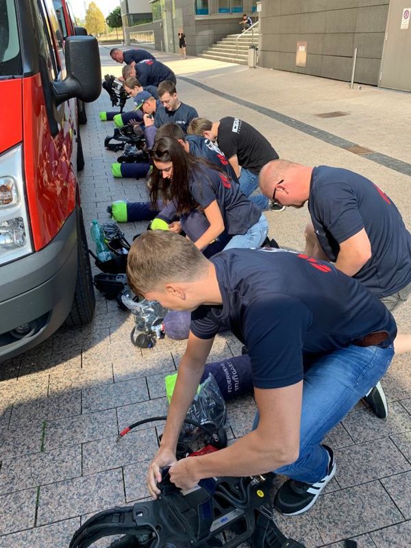Um für diese anstrengende Herausforderung gut gerüstet zu sein, begannen die neun Kameraden und eine Kameradin Anfang Mai mit der Vorbereitung. Jeden Mittwoch fand sich die Laufgruppe zum Training unter kompletter Ausrüstung ein. Hier wurde entweder das Hochhaus der Firma Porsche in der Lorenzstraße in Zuffenhausen (13 Etagen) oder das Hochhaus der EnBW im Fasanenhof (16 Etagen) jeweils mehrmals von unten nach oben gelaufen. Hier gilt ein besonderer Dank den beiden Firmen, dass sie ihre Gebäude zur Verfügung gestellt haben. Das Ganze hat auch nur funktioniert, da wir jede Woche entweder von der Zentralwerkstatt Atemschutz der Berufsfeuerwehrwache 4 aus Feuerbach oder von der Atemschutzwerkstatt der Werkfeuerwehr der Netze BW aus dem Gaswerk die Übungs-Atemschutzgeräte in so großer Anzahl bekommen haben.