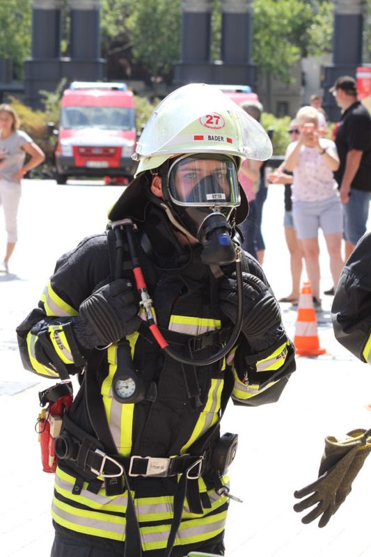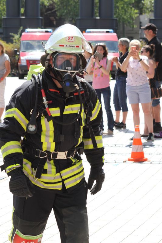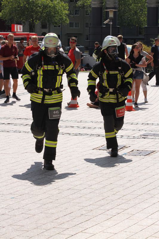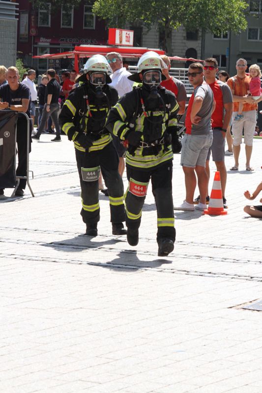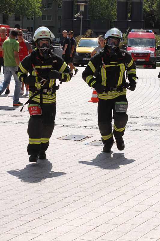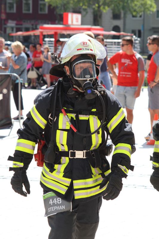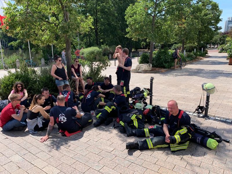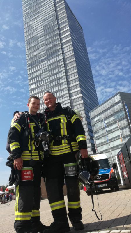 Am Samstagnachmittag ging es dann nach einer einsatzreichen Woche mit täglichen Einsätzen nach Köln. Dort wurde der Abend gemeinsam verbracht und in einem Hotel übernachtet. Am Sonntagfrüh wurde es dann Ernst. Nach dem Frühstück im Hotel fuhren wir zum Messeplatz in Köln. Dort trafen wir uns mit zwei Kameraden der Freiwilligen Feuerwehr Stuttgart-Degerloch. Diese waren ebenfalls am Start und haben unsere Atemschutzgeräte transportiert. Die beiden Degerlocher Kameraden waren um kurz nach 11:30 Uhr am Start. Unter dem Applaus der Zuschauer ging es los. Für die fünf Stammheimer Teams ging es dann um 13 Uhr los. Nach langem Warten in der heißen Mittagssonne wurde die Schutzausrüstung kontrolliert und dann erfolgte jeweils mit 45 Sekunden Zeitverzögerung der Startschuss. Die fünf Stammheimer Teams kamen alle im Ziel an, aber mussten körperlich zum Teil an ihre Grenzen gehen. Die 2er-Teams mussten immer gemeinsam im Ziel ankommen. Nach einer kurzen Pause oben, ging es mit dem Aufzug die 39 Etagen wieder abwärts, wo die Frauen und Freundinnen mit kühlen Getränken warteten. Am Ende waren alle zum Teil völlig erschöpft, aber glücklich über das Erreichte und der Treppenlauf 2020 kann kommen. Nach einigen Staus und Umfahrungen erreichten die beiden Stammheimer Mannschaftstransportwagen am Sonntagabend gegen 20 Uhr wieder Stammheim.