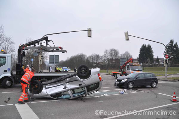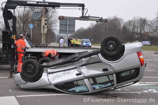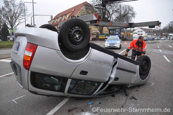 Am Freitag gegen 12:00 Uhr meldete ein Anrufer über den NOTRUF 112 einen schweren Verkehrsunfall auf der „Neuwirtshaus-Kreuzung". Ersten Meldungen zufolge lag ein PKW auf dem Dach und ein weiterer war im Frontbereich stark beschädigt. Zudem sollte eine Person noch im PKW eingeschlossen sein. Umgehend wurde durch die ILS-Stuttgart die Freiwillige Feuerwehr Stammheim und der Löschzug 4 der Berufsfeuerwehr Stuttgart mit dem Einsatzstichwort Verkehrsunfall 2 alarmiert.