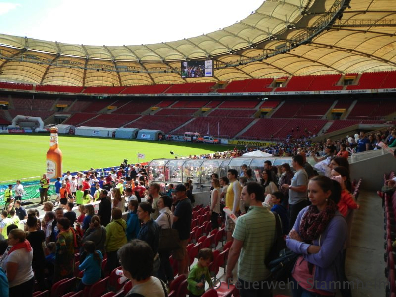Für die ersten Läufer des Halbmarathon- Staffellaufs ging es auf der Benzstraße in Richtung Untertürkheim los. Nach einer Laufstrecke von 6,6 km übergaben diese Läufer an der Gnesenerstr. das Staffelholz in Form eines Zeitchips an den zweiten Läufer der Staffel. Dieser lief bei z.T. strömenden Regen über Münster, Hofen, Mühlhausen und das Kefertal wieder zurück nach Münster und übergab nach absolvierten 8,1 km den Zeitchip auf der Reinhold- Maier- Brücke an den dritten Läufer. Der letzte Streckenabschnitt ging über 6,4 km von Münster nach Bad- Cannstatt mit dem Zieleinlauf in die Mercedes- Benz- Arena. Dort wurden die Läufer von ihren Fans auf der Haupttribüne empfangen.