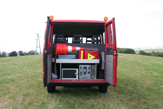 Verkehrsleitkegel, Absperrband und Warnleuchten ermöglichen im Einsatzfall eine Verkehrsabsicherung. Ein kleineres Sortiment an Werkzeugen (u.a. Brechstange, Nageleisen, Axt und Werkzeugkasten,...) steht im Fahrzeugheck zur Verfügung.